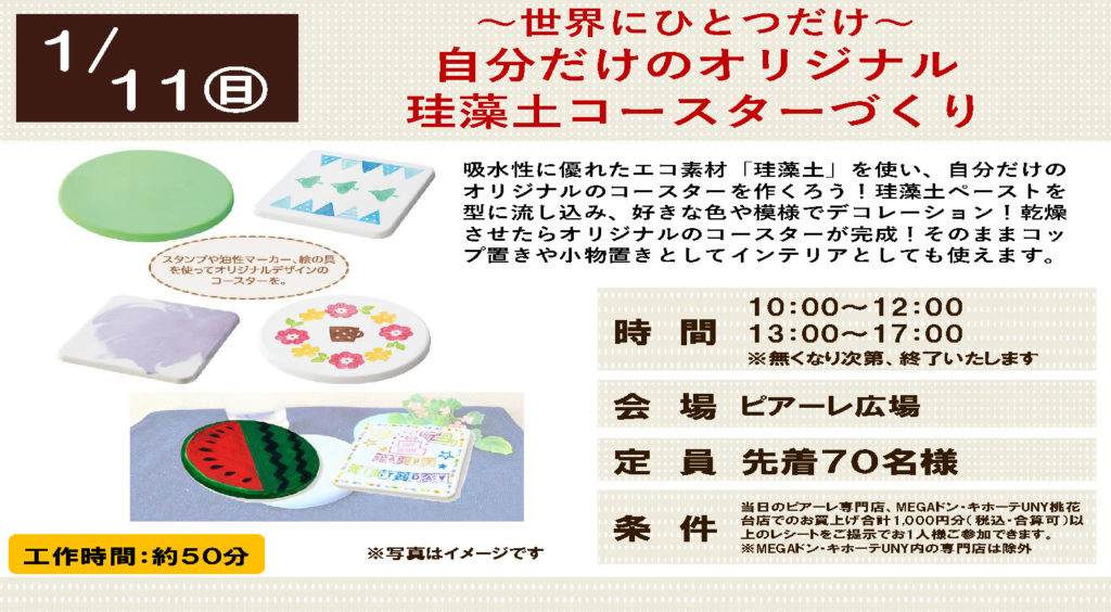 吸水性に優れたエコ素材「珪藻土」を使い、自分だけのオリジナルのコースターを作くろう!珪藻土ペーストを型に流し込み、好きな色や模様でデコレーション!乾燥させたらオリジナルのコースターが完成!そのままコップ置きや小物置きとしてインテリアとしても使えます。